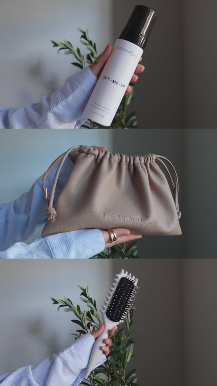 The ultimate curl-defining duo. Set-Me-Up hair foam shapes, sets, and controls frizz, while the UB Curl Brush sculpts and defines curls with dual-sided precision. Together, they create defined, bouncy, frizz-free curls, all packaged in our Vegan Leather Essentials Pouch, embossed with the UB signature logo as your luxury keepsake.